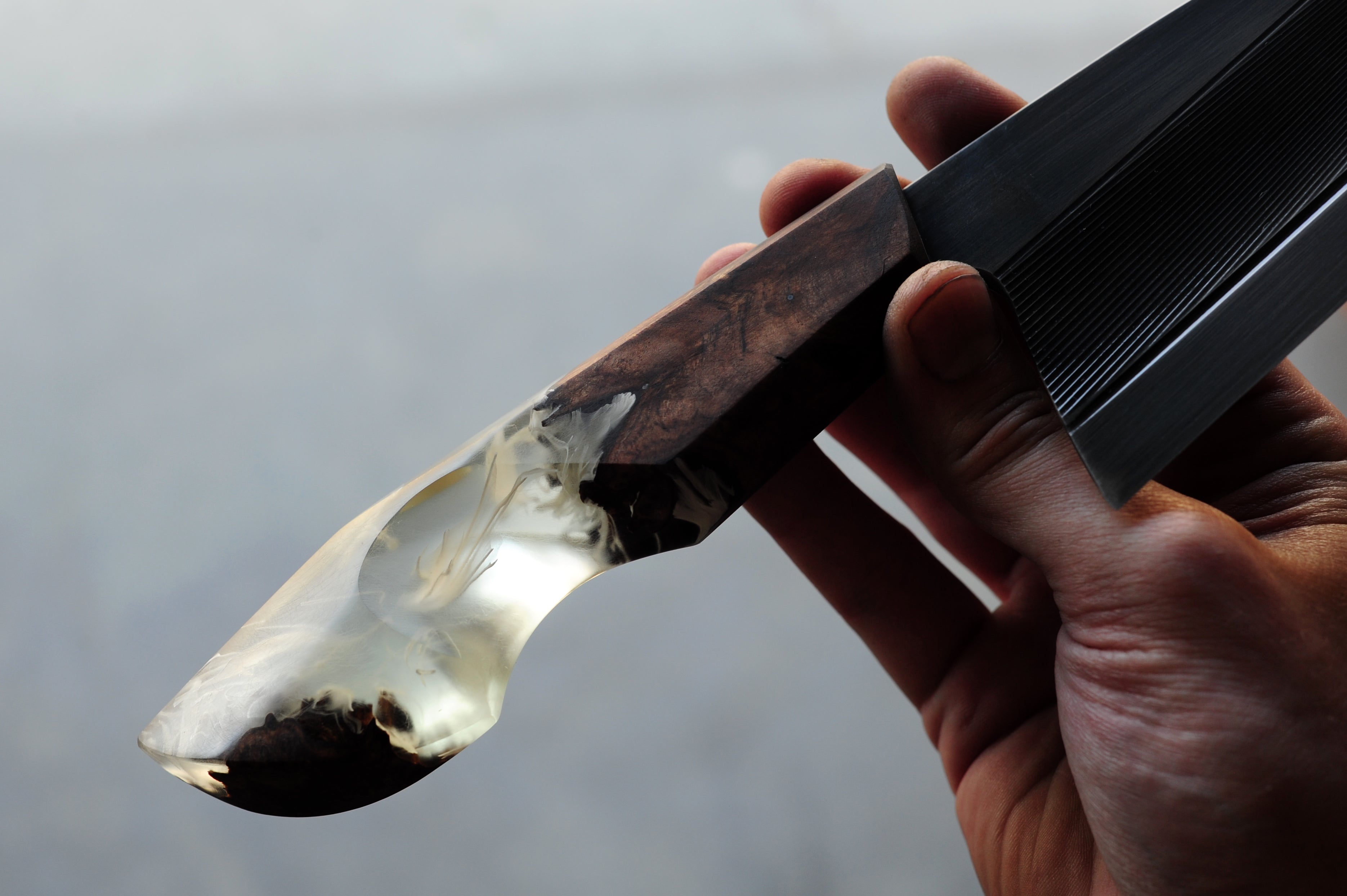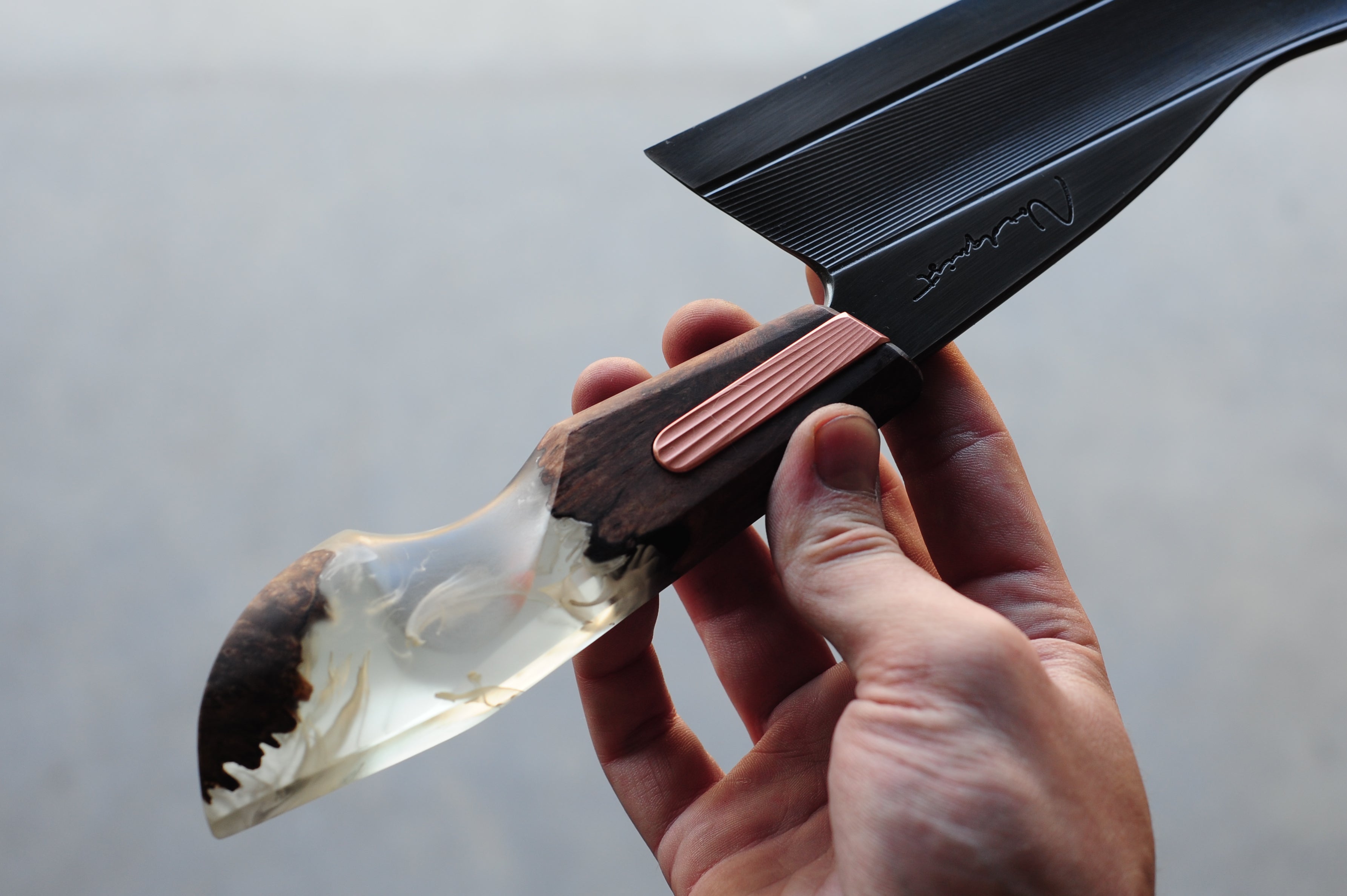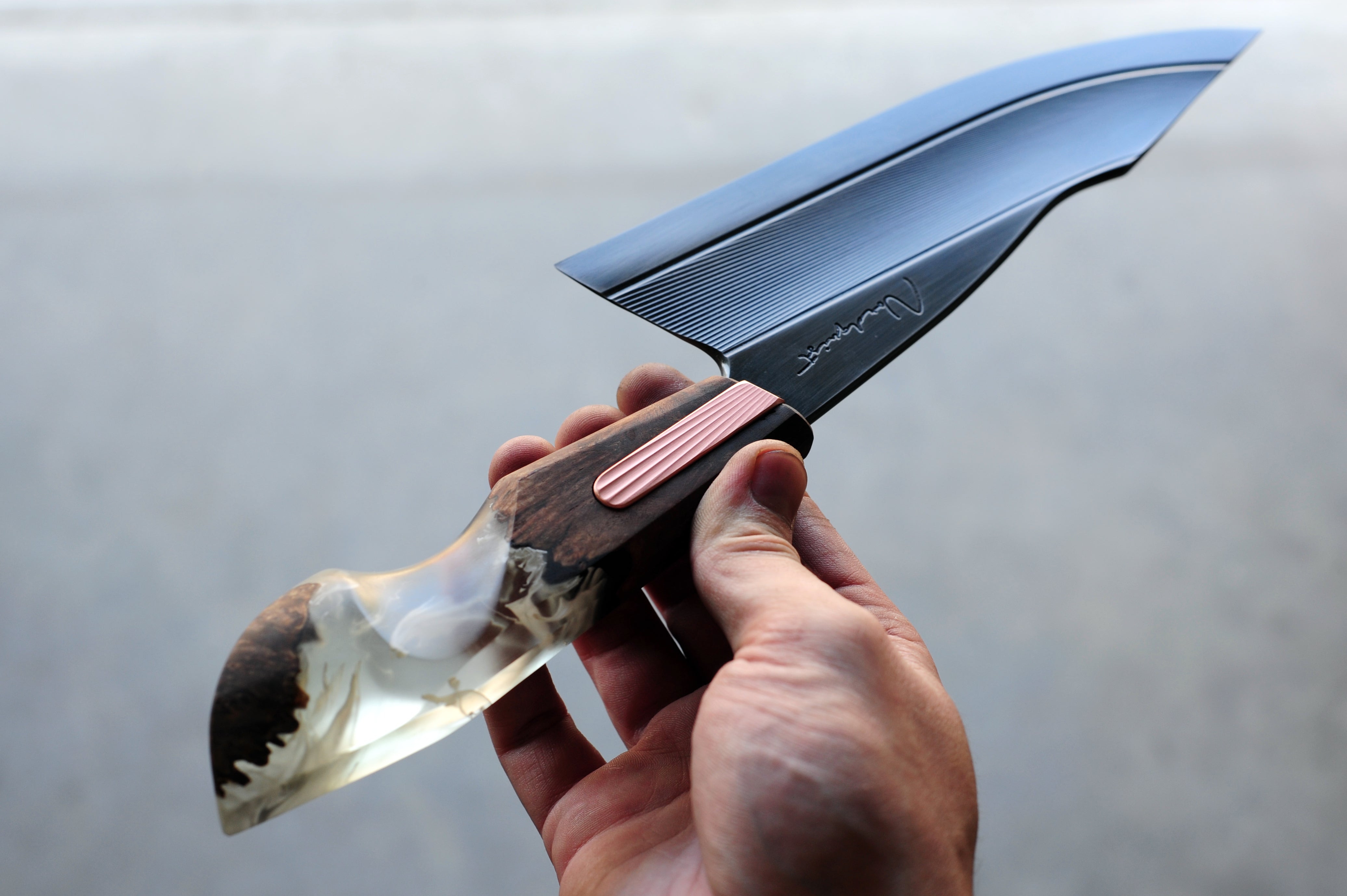 Its sculpted handle is crafted from stabilized chechen burl and copper. The blade has been hand rubbed to a satin finish and acid etched.