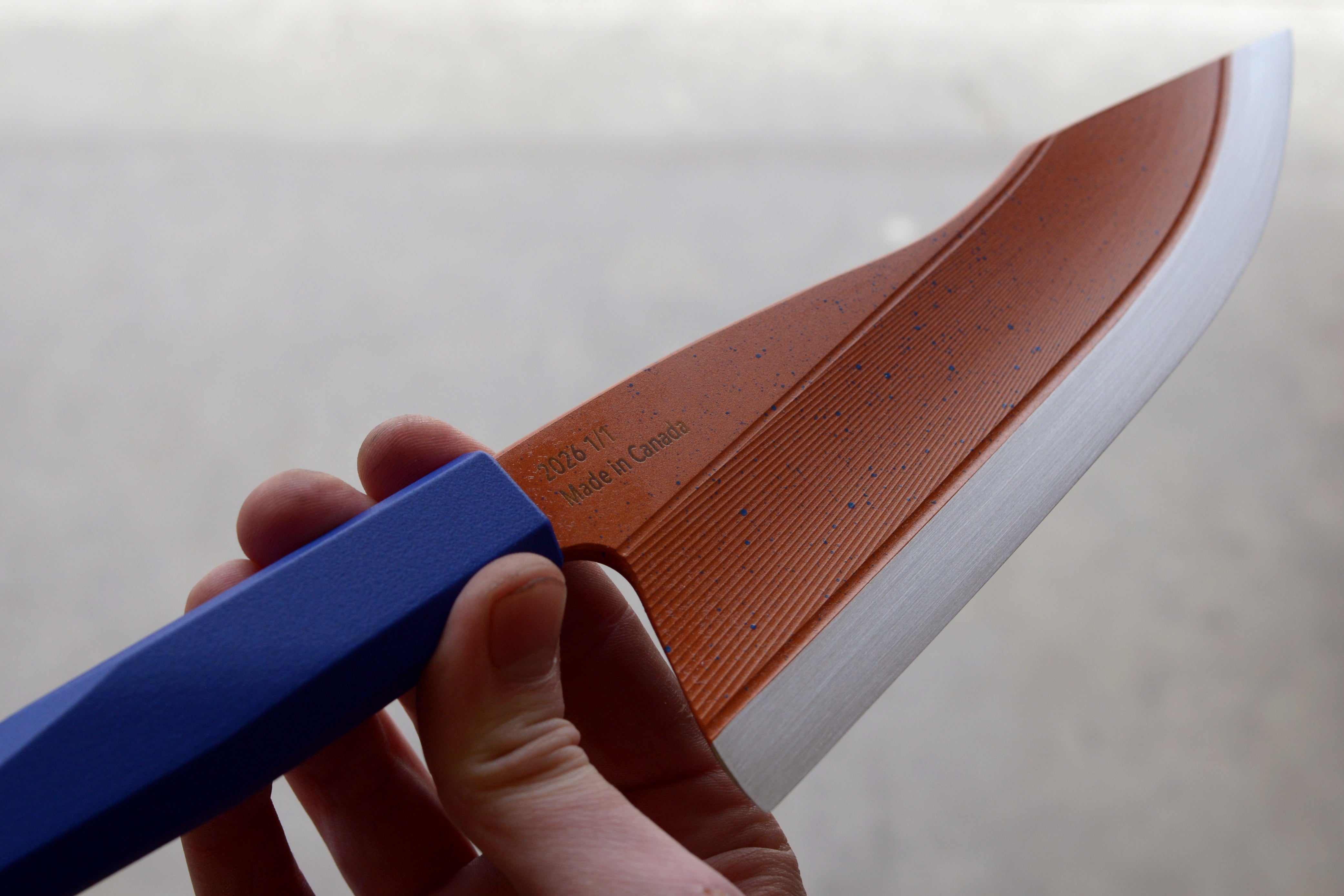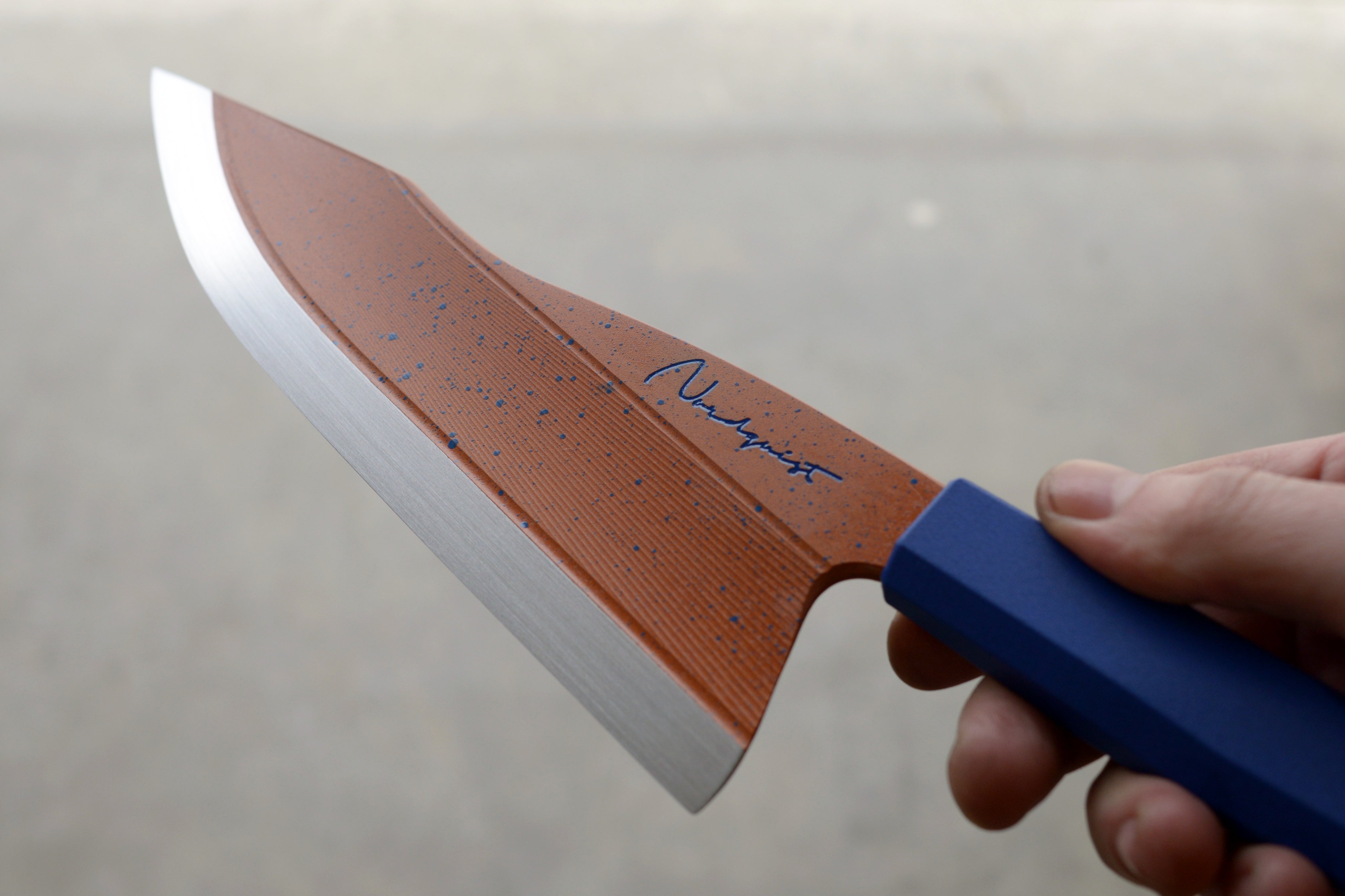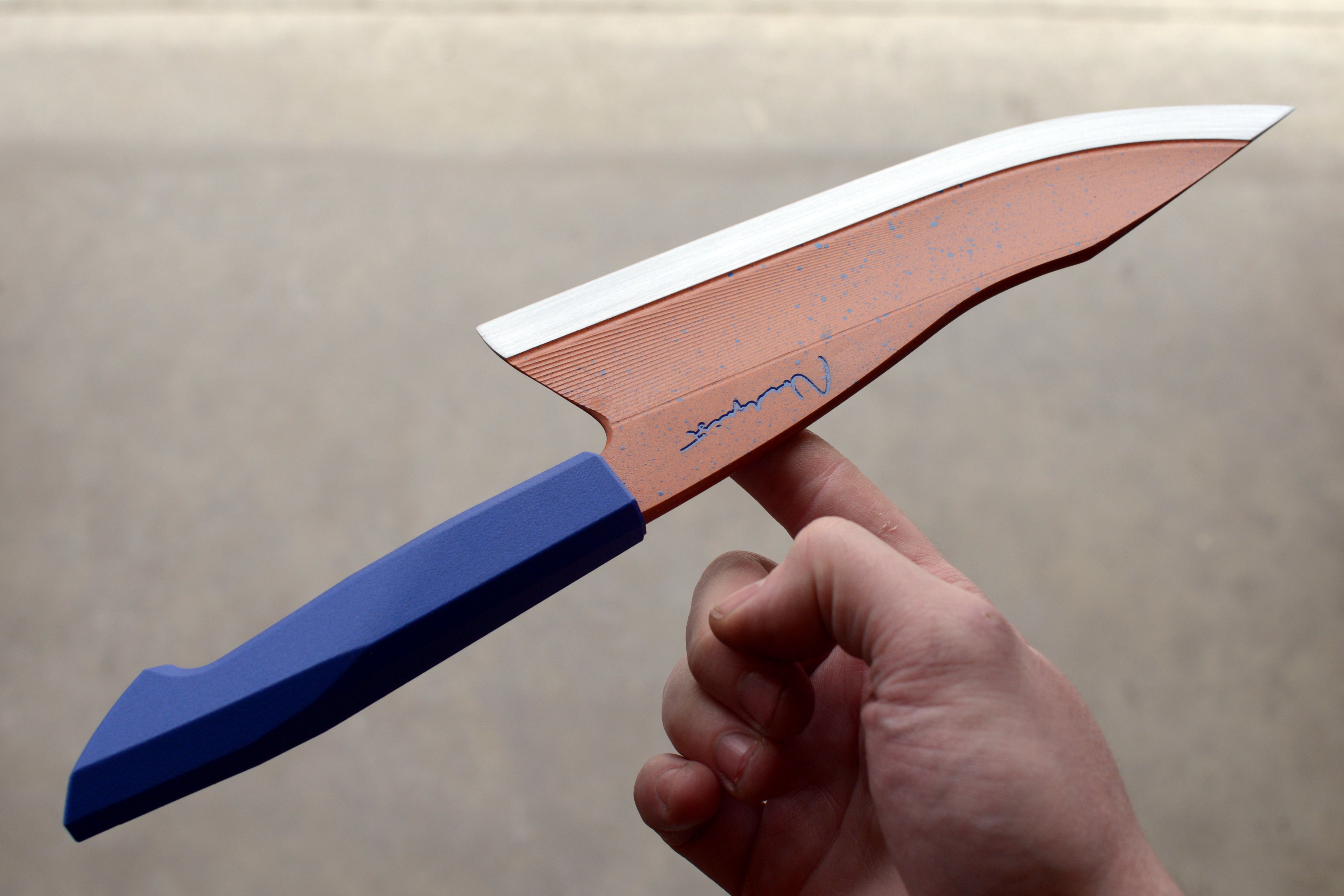This harpoon point chef is crafted from 52100 Carbon Steel and hardened to 62 Rockwell C. Inspired by my Limited Production Series these blades have my carbon fibre impregnated 3D printed handles and have been professionally cerakoted. Each blade is unique and engraved 2026 1/1. Includes a handle matched, friction fit saya.