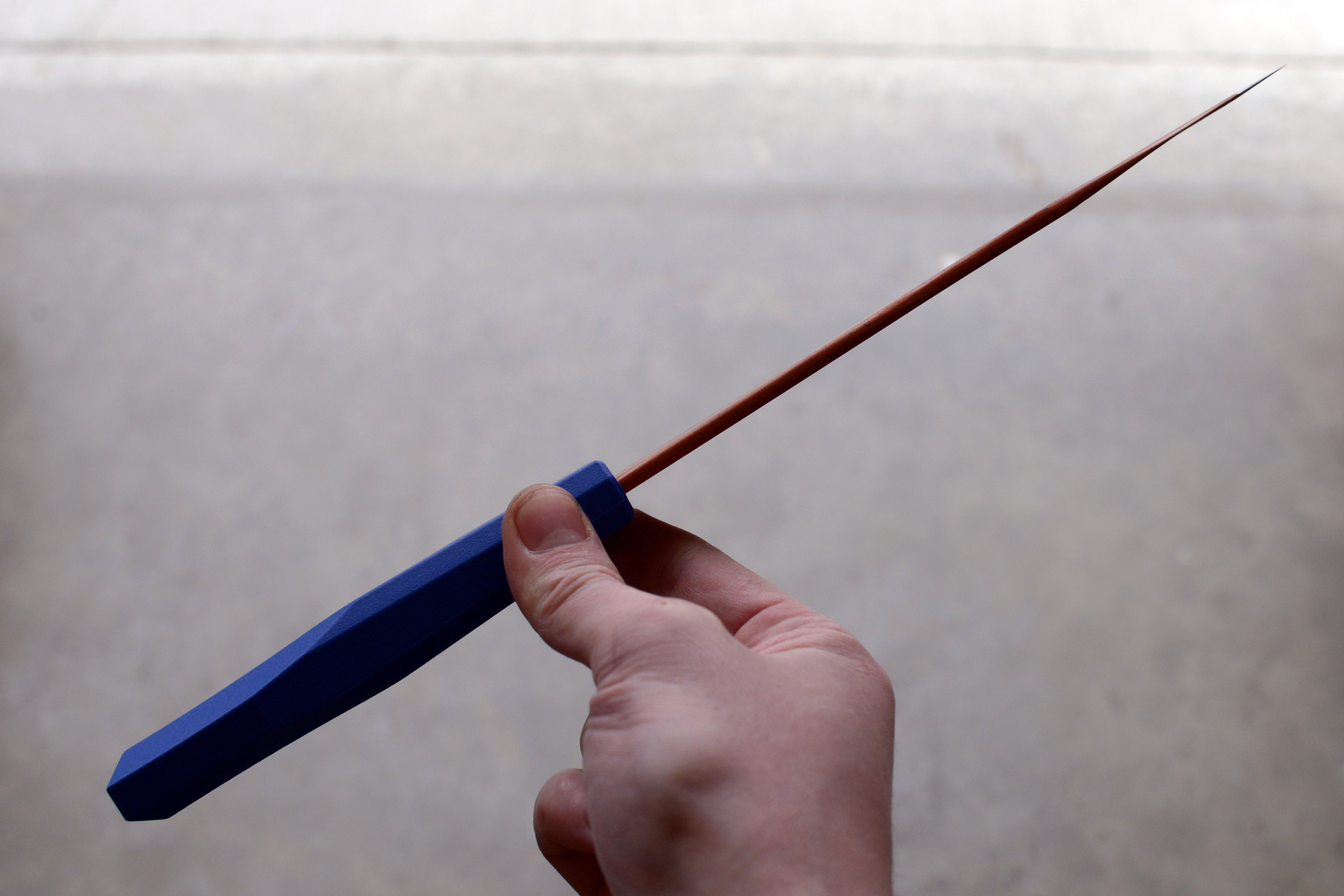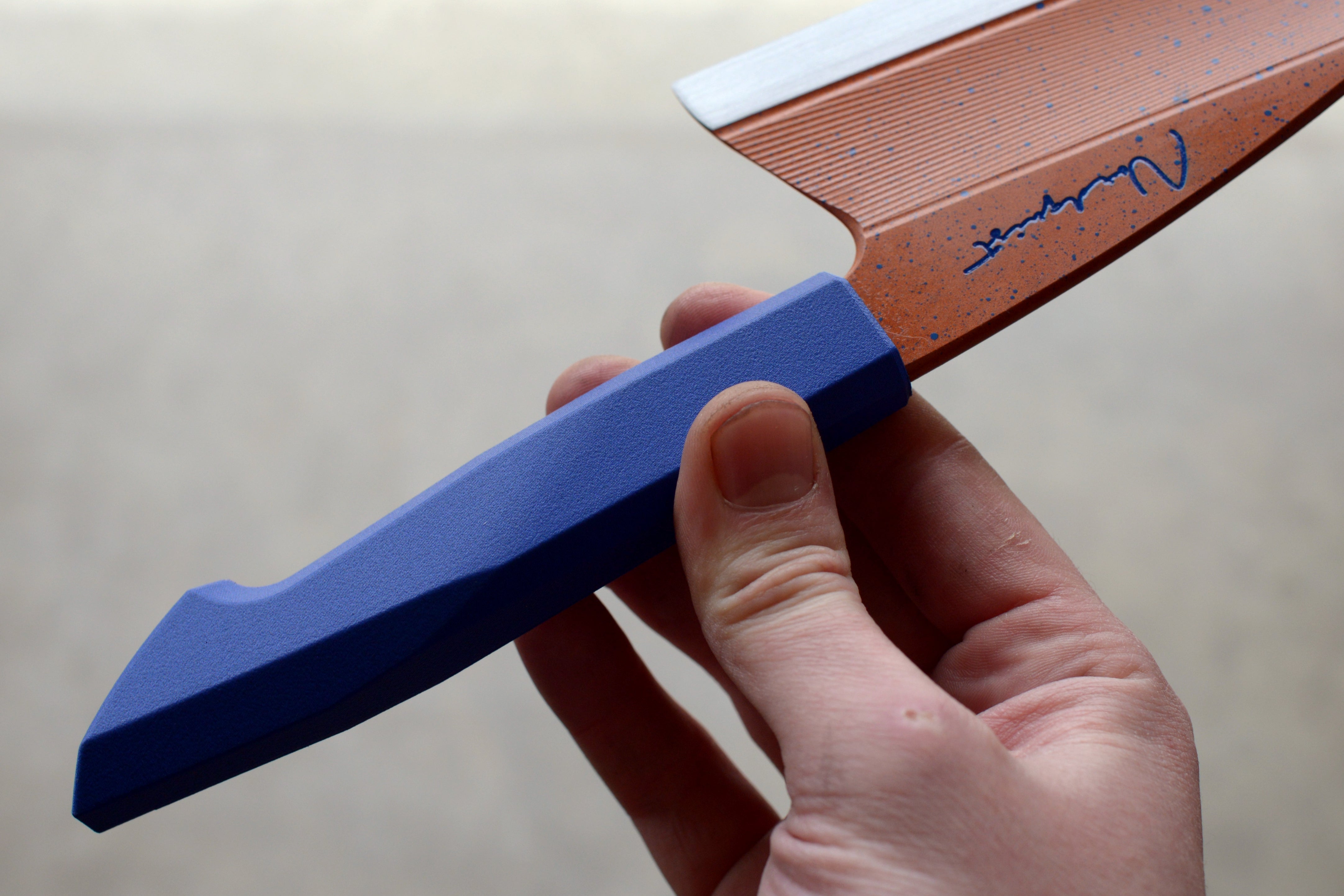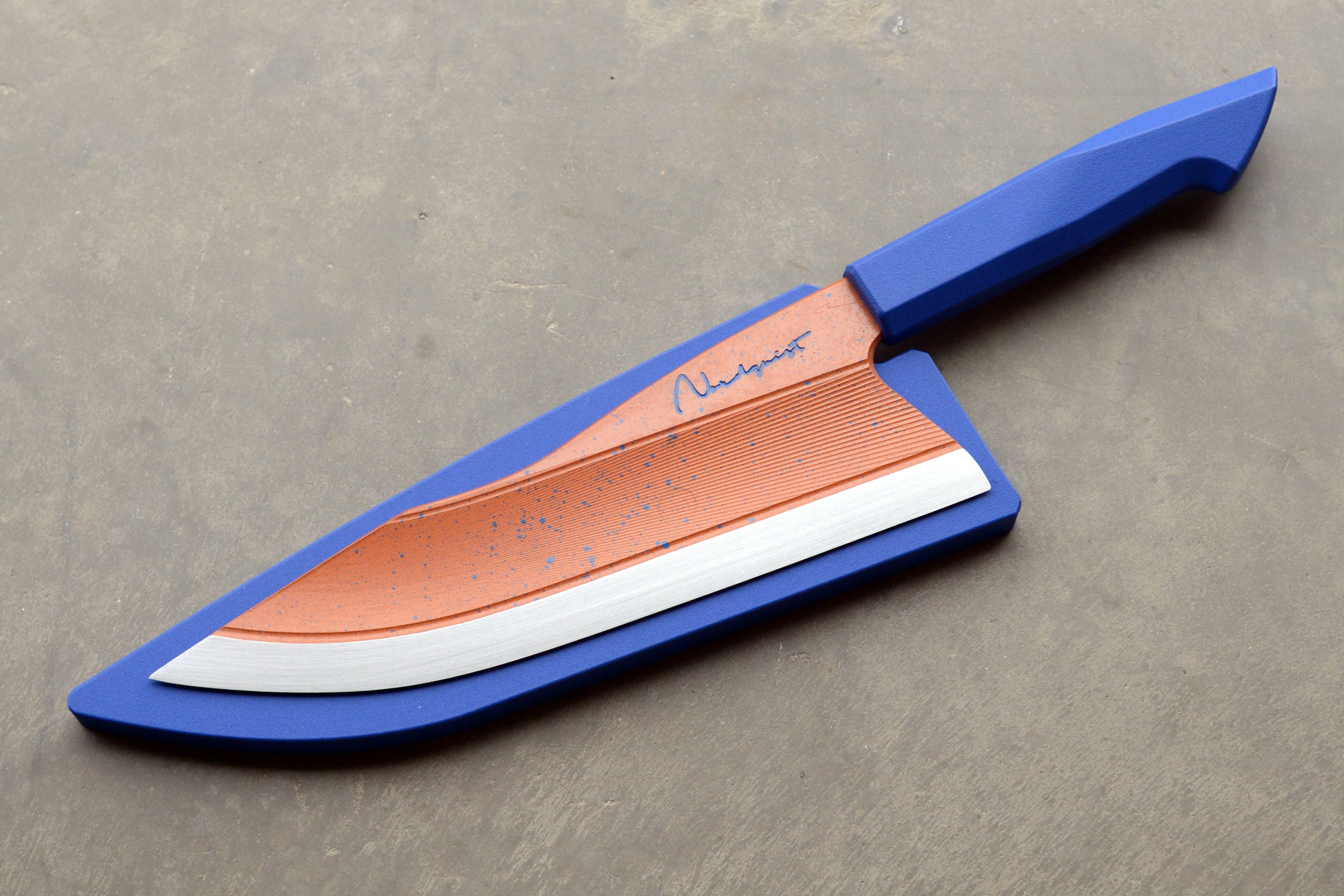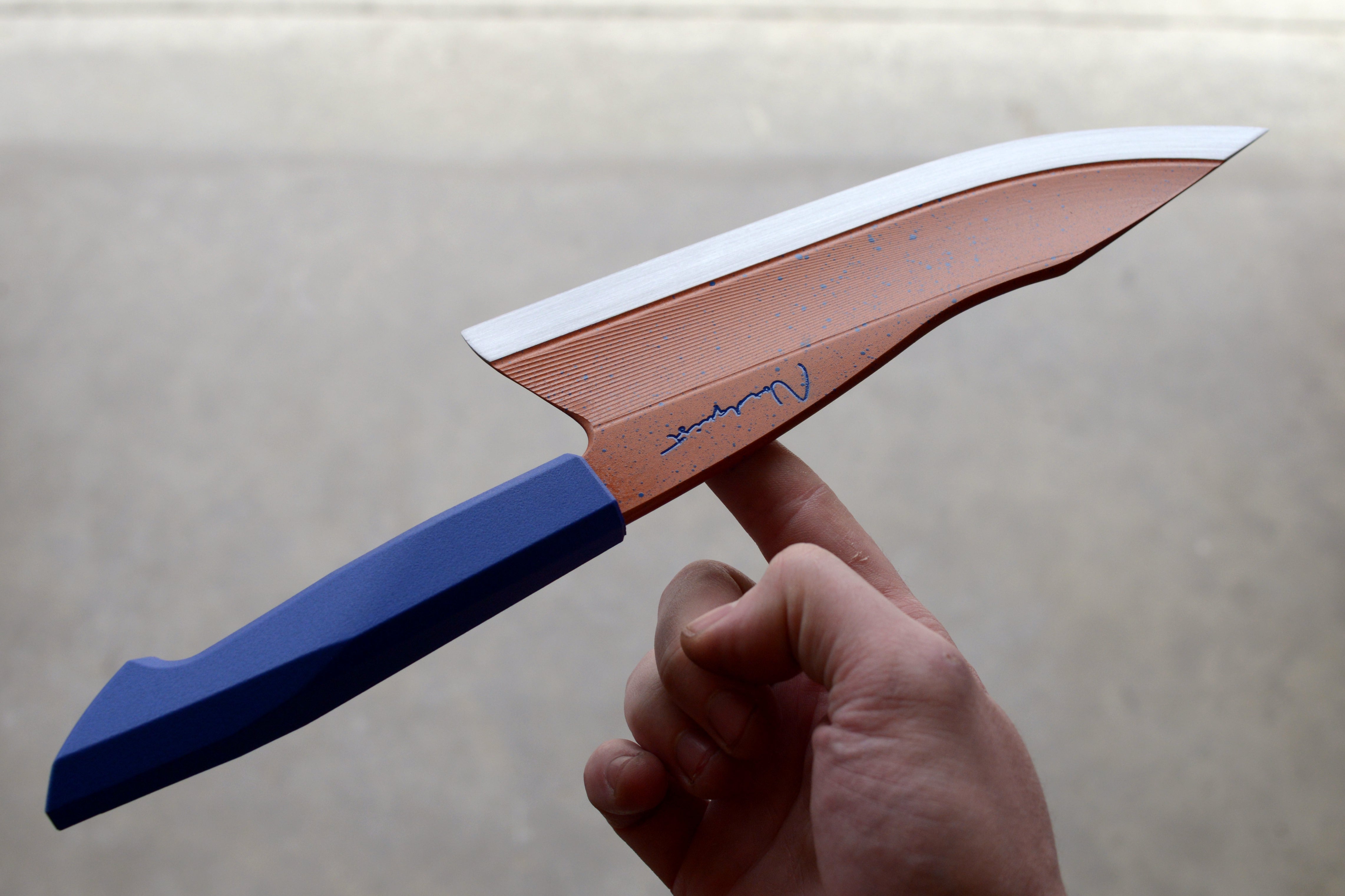 This harpoon point chef is crafted from 52100 Carbon Steel and hardened to 62 Rockwell C. Inspired by my Limited Production Series these blades have my carbon fibre impregnated 3D printed handles and have been professionally cerakoted. Each blade is unique and engraved 2026 1/1. Includes a handle matched, friction fit saya.